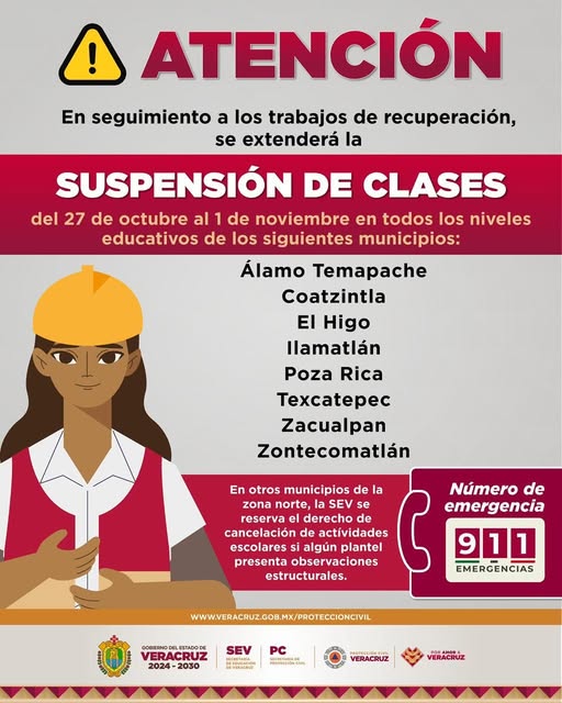 Extienden suspensión de clases en 8 municipios del norte, del 27 de octubre al 1 de noviembre octubre 24, 2025 FacebookTwitterWhatsAppTelegram En seguimiento a los trabajos de recuperación, se extenderá la suspensión de clases y actividades escolares para todos los niveles en los siguientes municipios: