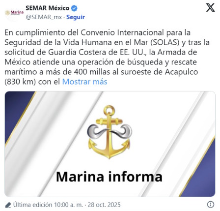 Tras esto, la Semar informó en su cuenta de X que el rescate ocurrió a 830 km del suroeste de Acapulco y en el que se vieron involucrados un buque de patrulla oceánica y un avión marítimo.