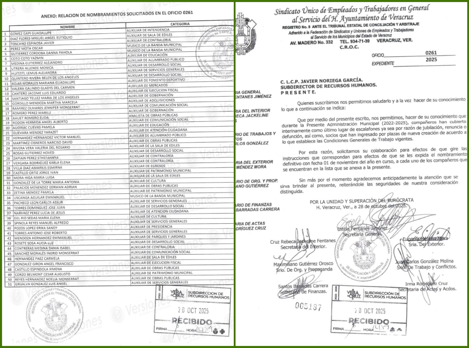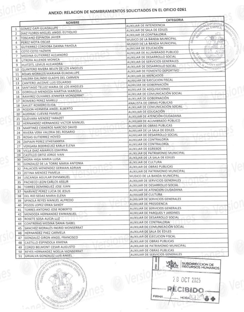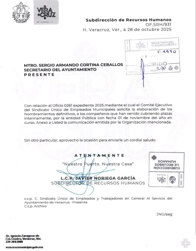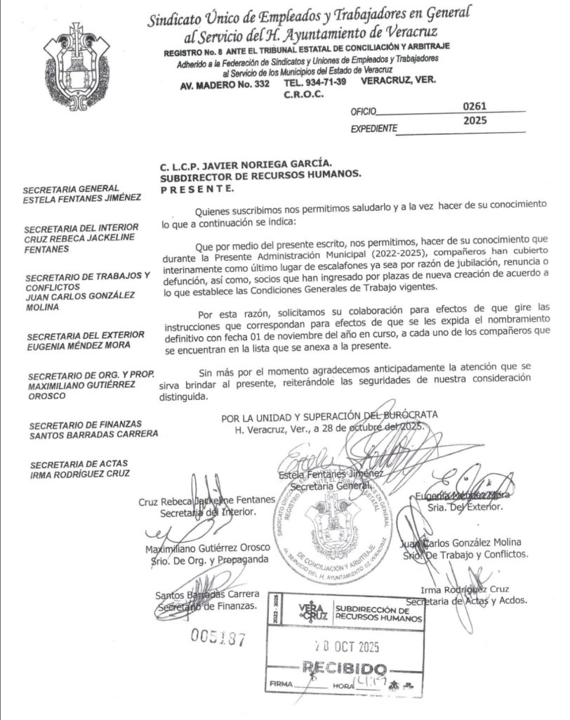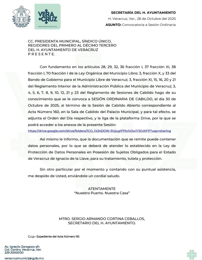 Para este jueves 30 de octubre, Patricia Lobeira, alcaldesa de Veracruz, está citando a una sesión de Cabildo en la que entre otros asuntos, pretenden aprobar la elaboración de nombramientos definitivos, del Sindicato Único de Empleados y Trabajadores en General al Servicio del Ayuntamiento de Veracruz, a petición de la Subdirección de Recursos Humanos, realizada mediante el oficio número SRH/931.