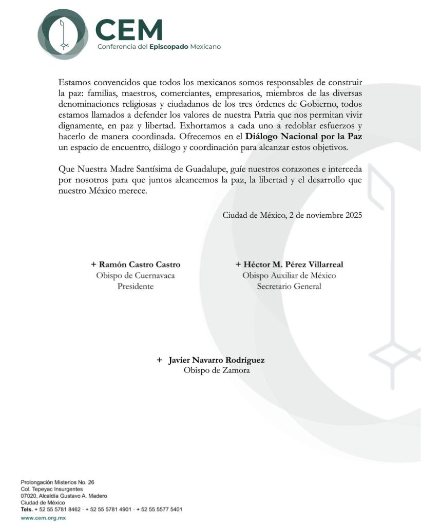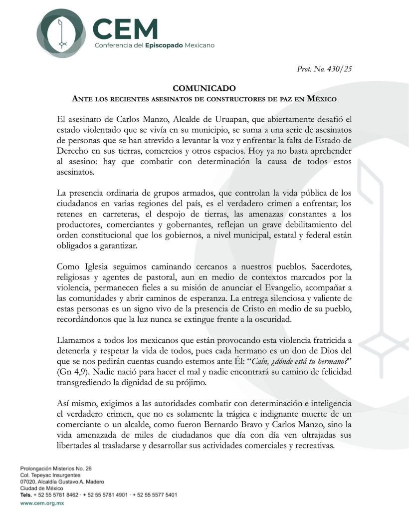 Obispos condenan asesinato de Manzo y lamentan que «grupos armados controlen la vida pública en varias regiones del país» noviembre 2, 2025 FacebookTwitterWhatsAppTelegram
