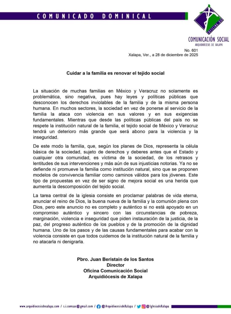 Deterioro del tejido social puede abonar a inseguridad y violencia en Veracruz: Arquidiócesis de Xalapa diciembre 28, 2025 FacebookTwitterWhatsAppTelegram