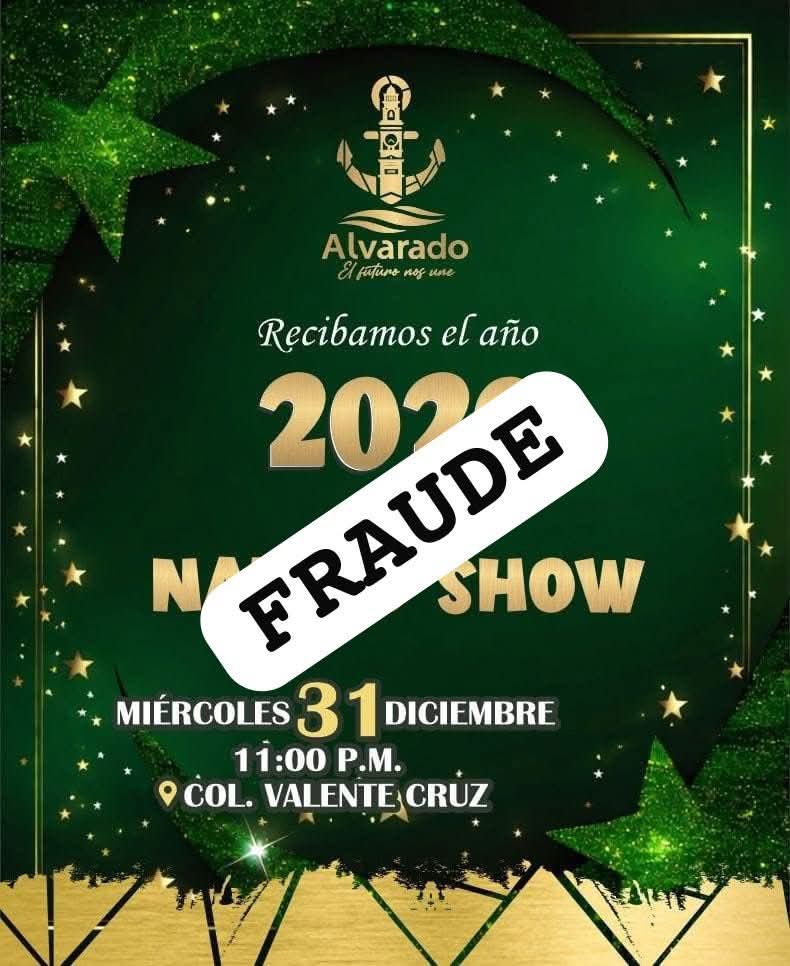 «Les informamos que el Grupo Musical Nativo Show No tiene ningún contrato firmado con el Ayuntamiento de Alvarado, Veracruz. Por tal motivo, No nos presentaremos este Miércoles 31 de Diciembre, les hacemos de su conocimiento las acciones legales que estamos llevando a cabo en este momento. DIGAN NO A LA PIRATERÍA».