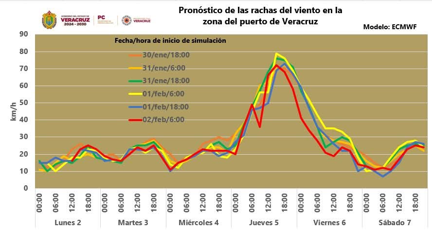 Los modelos de pronóstico coinciden en indicar la probable ocurrencia de un #Norte en costas de Veracruz durante el jueves 5 de febrero, con rachas de 65 a 85 km/h en costas y de 40 a 55 km/h entre Xalapa, Naolinco, Misantla y el valle de Perote, informa Protección Civil estatal.