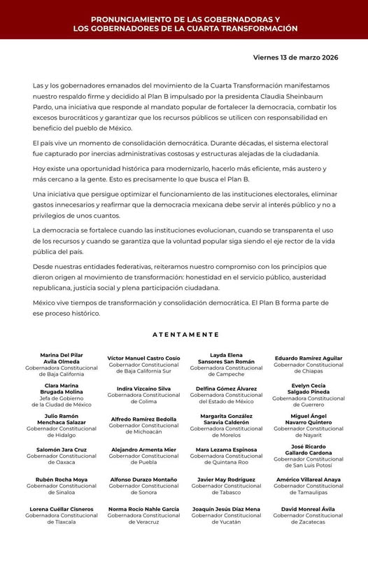 En un desplegado difundido este viernes 13 de marzo, los mandatarios y mandatarias estatales cerraron filas en torno a la Presidenta de México.