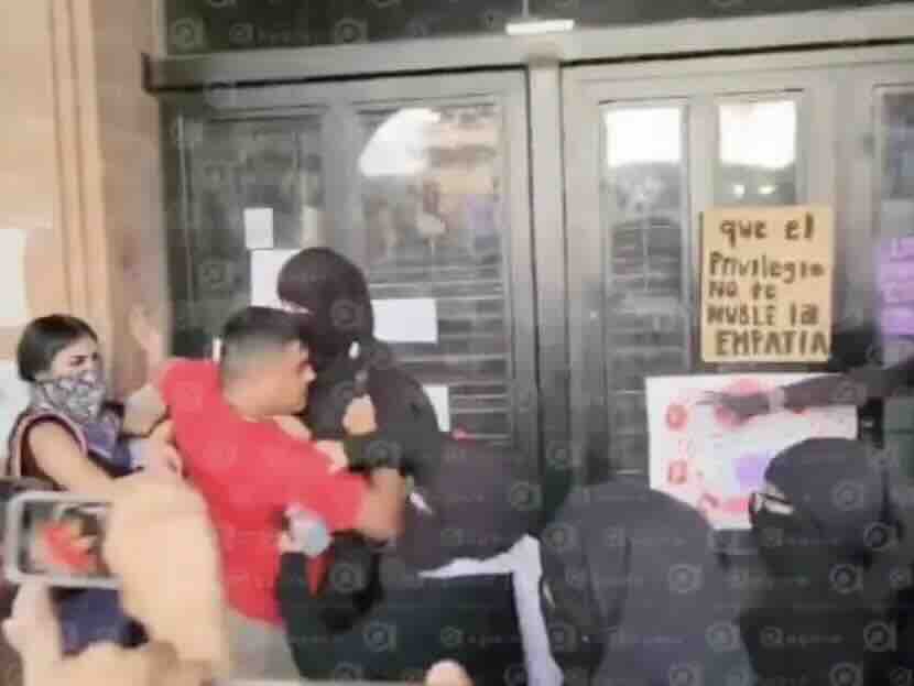 Todo ocurrió porque un hombre se colocó en la puerta de la Presidencia Municipal durante la marcha feminista e intento detener a las mujeres que se manifestaban y que pretendían causar daños al edificio.