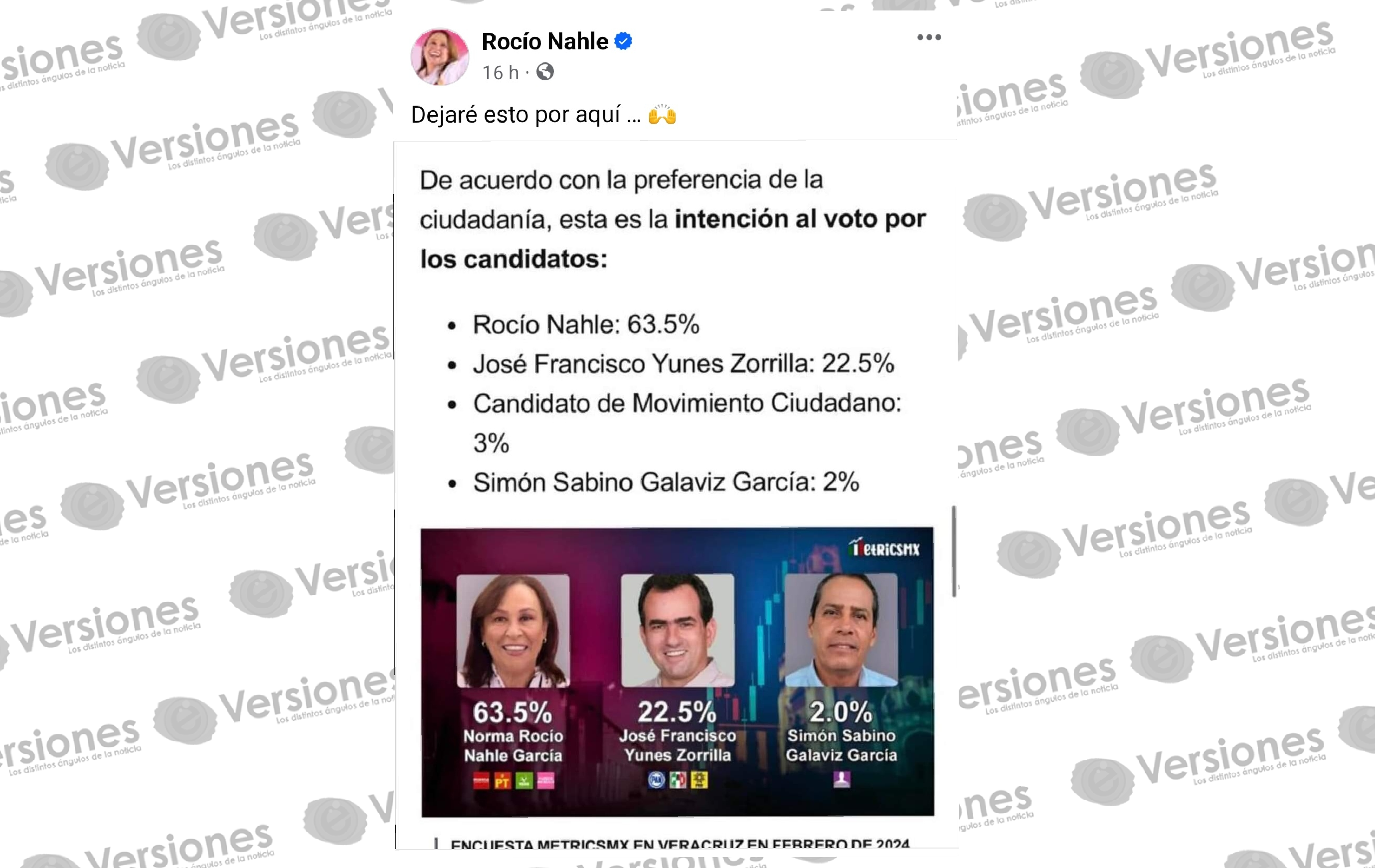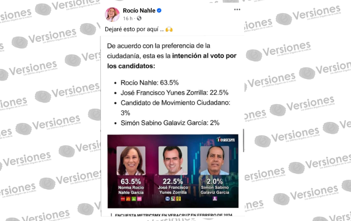 Luego de la polémica generada por presuntas propiedades, la candidata a la gubernatura de Veracruz por la alianza Morena-PT-PVEM-FxM Veracruz, Rocío Nahle García, dio a conocer en sus redes sociales una encuesta en la que casi triplica en intención del voto a Pepe Yunes, abanderado a gobernador por la coalición integrada por PRI-PAN-PRD.