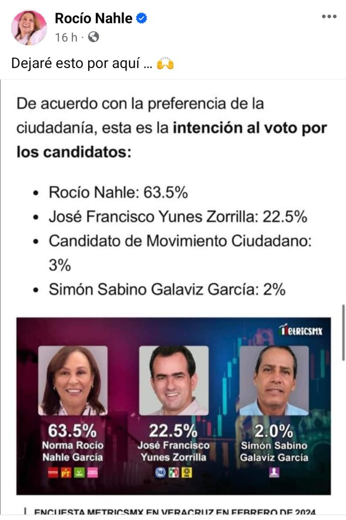 «Dejaré esto por aquí…», puso en sus redes, para luego insertar una encuesta en la que Nahle aparece con 63.5% de intención del voto contra 22.5% de Pepe Yunes.
