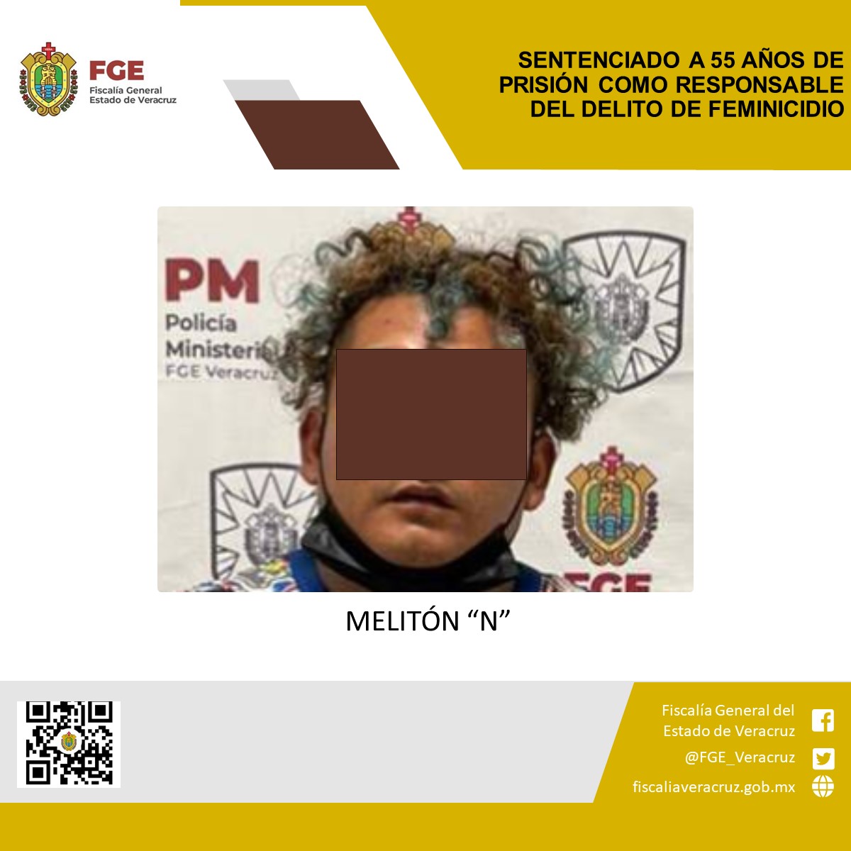 En Cosamaloapan, de 55 años de prisión en contra de Melitón “N” como responsable del delito de feminicidio en agravio de su concubina, hechos ocurridos el 16 de febrero de 2022 en la colonia San Felipe, de este municipio, cuando agredió de manera física con un machete a la víctima y le causó diversas lesiones hasta provocar su muerte, dentro del juicio oral 7/2023.