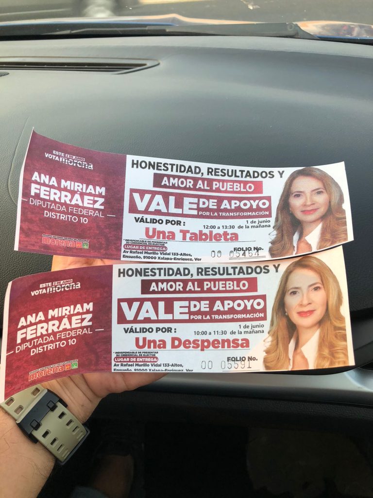 Desesperada porque las últimas encuestas la ubican en segundo lugar, la candidata a diputada federal por Xalapa por Morena, Ana Miriam Ferráez Centeno, regala despensas y tabletas electrónicas (tablets).