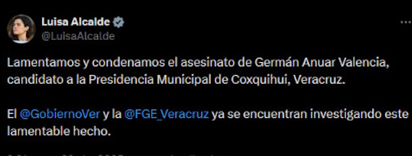 Luisa María alcalde Luján, dirigente nacional del partido Morena lamentó y condenó el asesinato de Germán Anuar Valencia, candidato a la presidencia municipal de Coxquihui en Veracruz.