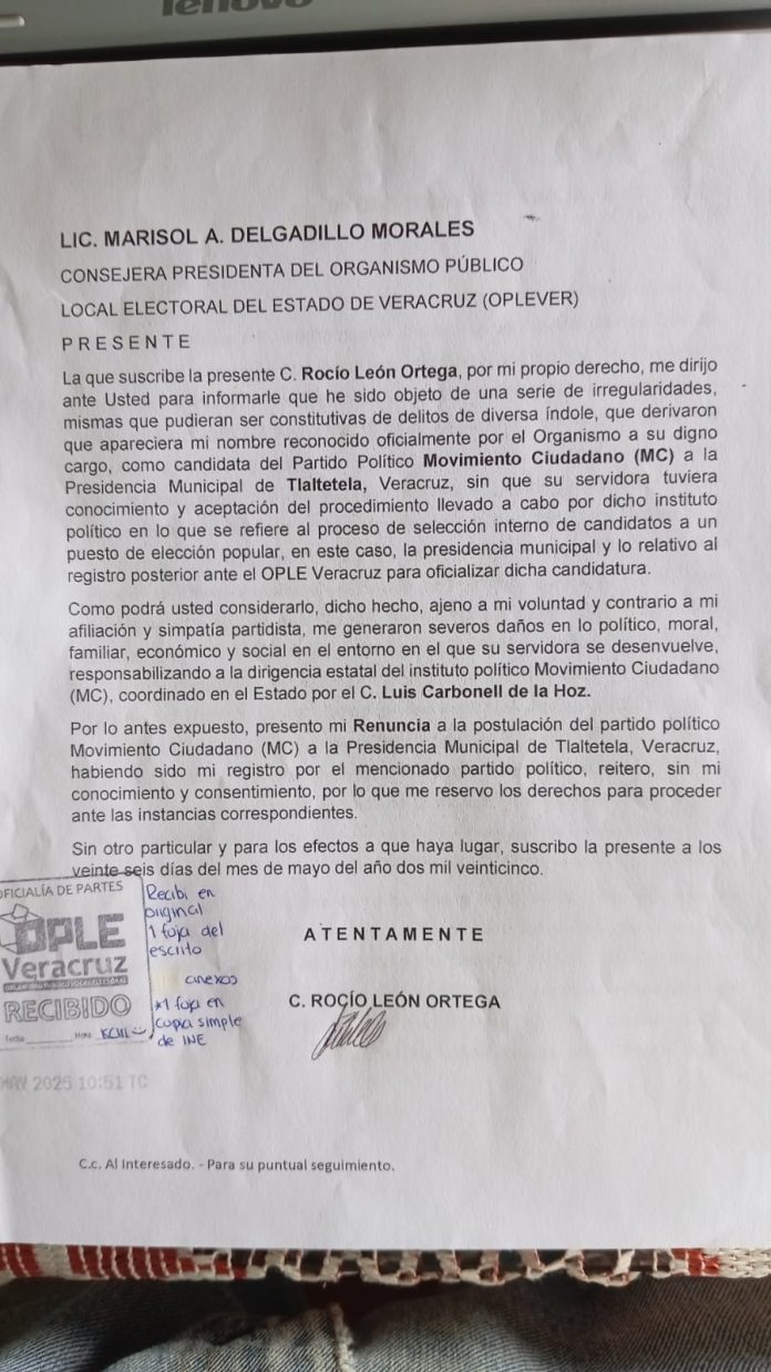 Rocío León Ortega, Evelia Fuentes Vásquez y Dionicia Ortega Vásquez, son tres ciudadanas residentes de la cabecera municipal de Tlaltetela, que hasta hace muy pocos días vivían tranquilas dedicadas a la venta de comida y al cuidado de su casa e hijos, hasta que una mañana del pasado mes de abril, vieron sus nombres publicados oficialmente en el Organismo Público Local Electoral de Veracruz, ostentándose como candidatas propietarias a la presidencia municipal, regiduría primera y segunda, respectivamente, registradas por la dirigencia estatal del partido Movimiento Ciudadano MC, sin que mediara autorización y conocimiento alguno de ellas.