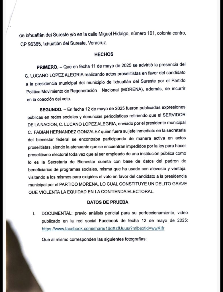 En Ixhuatlán del Sureste presentaron una denuncia ante la Fiscalía Especializada en Delitos Electorales en contra del servidor de la nación, Lucano López Alegría, por presuntamente condicionar los apoyos sociales a cambio de que voten por el candidato de Morena, Enrique Arévalo Guillén.