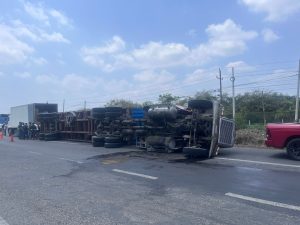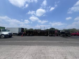 Guardia Nacional División Carreteras se hizo cargo de la unidad accidentada, donde trabajadores de la empresa, propiedad del tráiler volcado, cargaron la mercancía del vehículo accidentado a otra unidad.