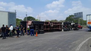 Debido a lo anterior, el tráiler se volcó sobre su costado izquierdo, por lo que un vehículo particular estuvo a punto de impactarse con él.