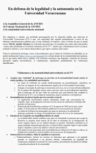 Jorge Manzo, Marisol Luna y Rafael Vela, aspirantes a la rectoría de la UV, pidieron el respaldo de la Asamblea General y del Consejo Nacional de la Asociación Nacional de Universidades e Instituciones de Educación Superior (ANUIES), así como de toda la comunidad universitaria del país, para frenar la pretensión del actual rector de la UV, Martín Aguilar, de prolongar su mandato mediante una prórroga, cuya legalidad ha sido cuestionada por destacados juristas.