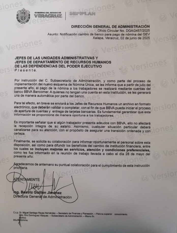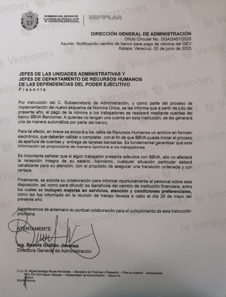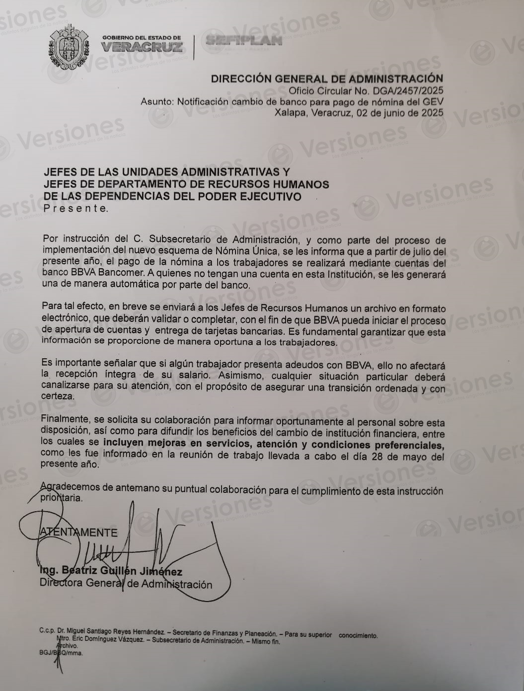 Y ahora, mediante una circular que dirige la directora general de Administración de Sefiplan, Beatriz Guillén Jiménez, a los jefes de las unidades administrativas y jefes de departamento de Recursos Humanos de las dependencias del Poder Ejecutivo, les informa de las nuevas disposiciones para la implementación «del nuevo esquema de Nómina Única».