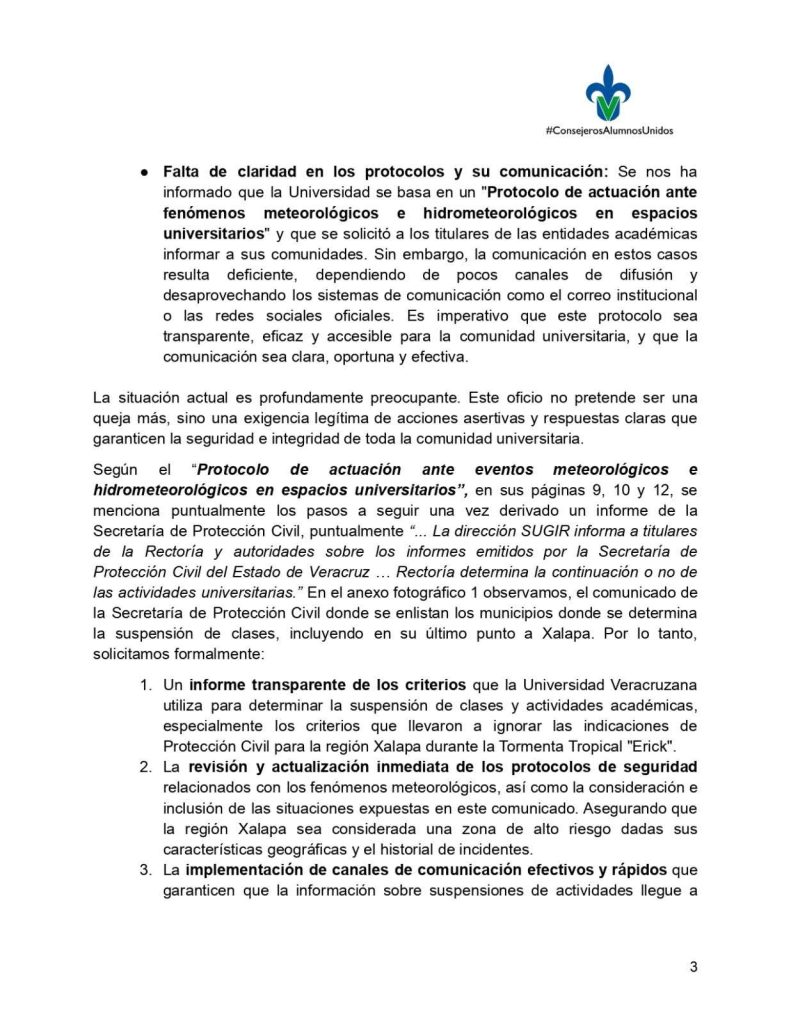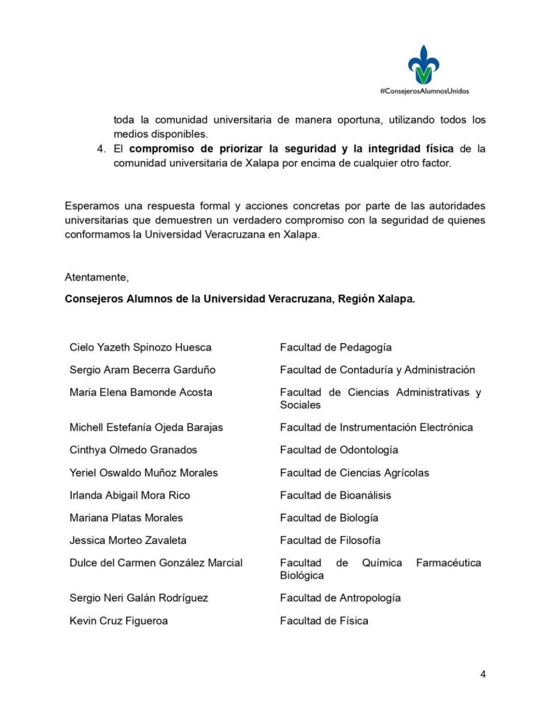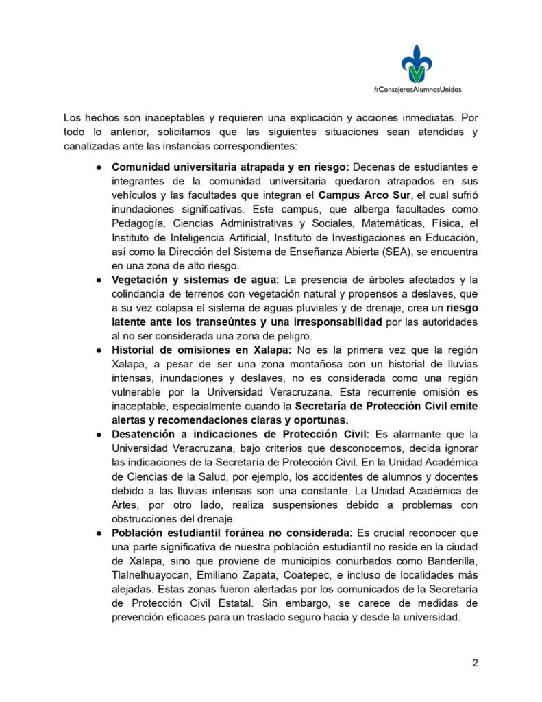 «Hoy la comunidad universitaria enfrentó las siguientes problemáticas ante la toma de decisión de no suspender actividades para estudiantes, académicos y personal administrativo de la Región Xalapa»: