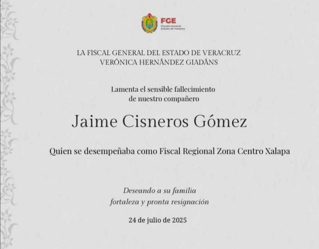 Este jueves se reportó el fallecimiento de Jaime Cisneros Gómez, quien se desempeñaba como Fiscal Regional de la Zona Centro-Xalapa del estado de Veracruz.