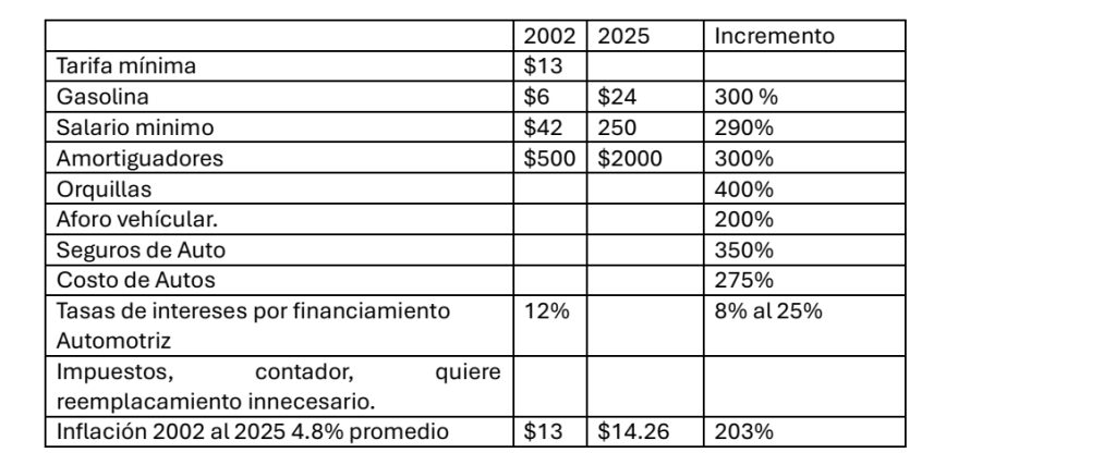 Tarifa mínima era de $13 pesos la gasolina costaba $6 y el salario mínimo era de $42 pesos la gasolina cuesta 24 pesos y el salario mínimo 250 pesos el incremento en gasolina es del 300% y en salario del 490%. Además, las refacciones también han aumentado significativamente con un incremento del 300% en amortiguadores y llantas y del 400% en horquillas la inflación acumulada el aforo vehicular ha aumentado triplicando los tiempos de traslado en algunas rutas los seguros son 350 por ciento más caros y los autos 275% las tasas de interés para adquirir un vehículo también han subido variando entre el 8% y el 25% considerando todos estos factores la tarifa mínima razonable y además justificada debería ser de 42.50 pesos para Xalapa y debería interpretarse los mismos factores para todo el estado con sus variables particulares.