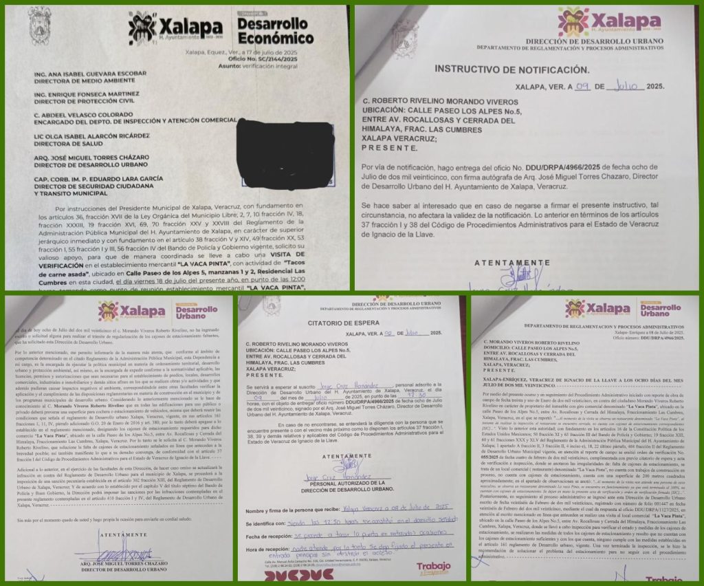 Con fecha del 17 de julio 2025, el director de Desarrollo Económico municipal, Jesús Lozano Grajales, solicitó a la directora de Medio Ambiente, Ana Isabel Guevara Escobar; al director de Protección Civil, Enrique Fonseca Martínez; al encargado del Departamento de Inspección y Atención Comercial, Abdeel Velasco Colorado; a la directora de Salud, Olga Isabel Alarcón Ricárdez; a José Miguel Torres Cházaro, director de Desarrollo Urbano y al Capitán Eduardo Lara García, director de Seguridad Ciudadana y Tránsito Municipal, realizar una “Visita de Verificación” al restaurante “La Vaca Pinta”.