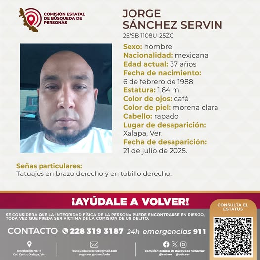 En la ficha emitida por la Comisión Estatal de Búsqueda de Veracruz se consignan los datos: estatura (1.64), sus señas particulares, su ausencia. El folio es 25/SB1108U-25ZC.