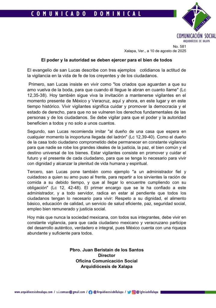 El poder y la autoridad se deben ejercer para el bien de todos: Arquidiócesis de Xalapa agosto 10, 2025 FacebookTwitterWhatsAppTelegram