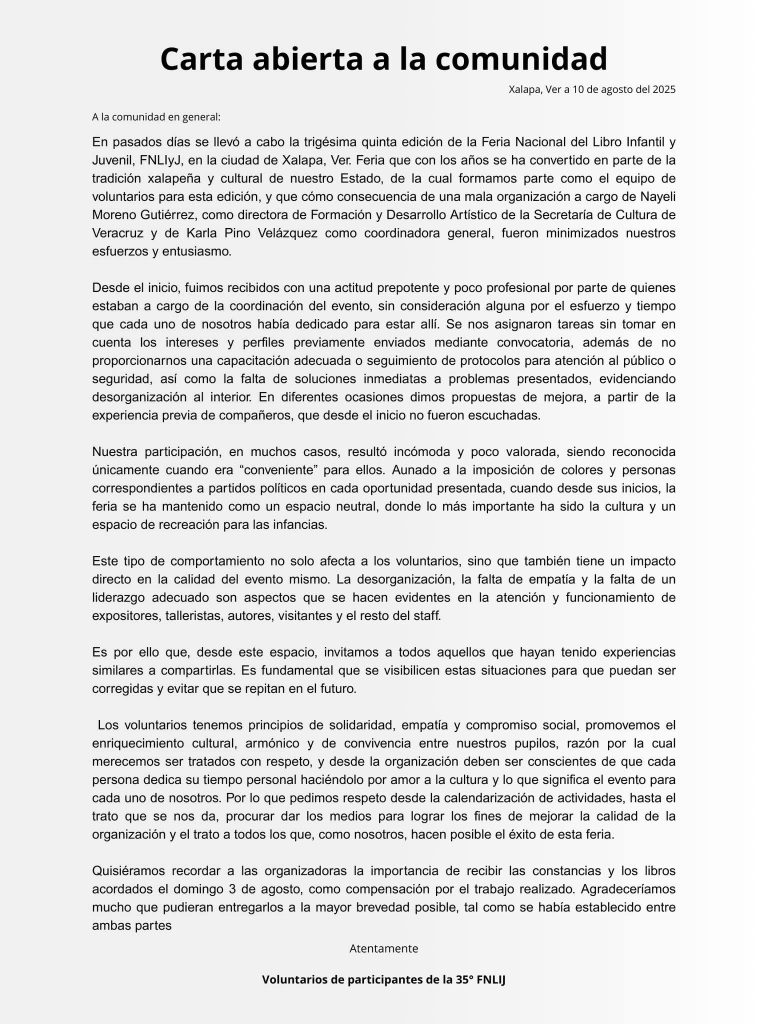 Voluntarios de la feria nacional del libro infantil y juvenil se quejan de desorganización y malos tratos de funcionarios agosto 13, 2025 FacebookTwitterWhatsAppTelegram