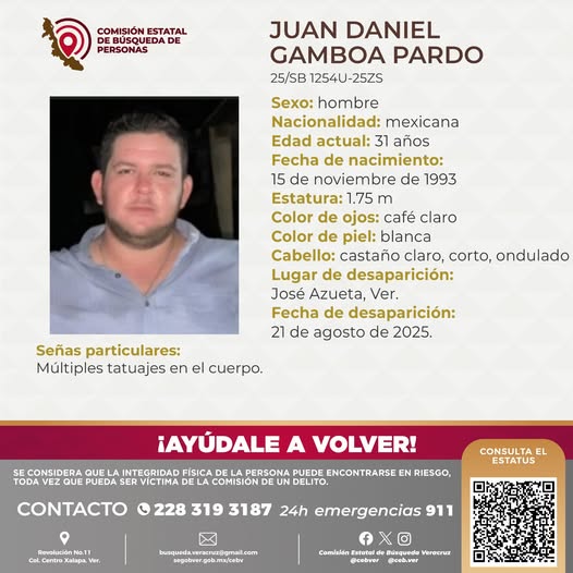 Jesús Gamboa Rodríguez, presidente del Comité Local del Partido Acción Nacional en Villa Azueta, solicita el apoyo de la comunidad para localizar a su hijo, Daniel Gamboa, quien salió de su domicilio la noche del pasado jueves 21 de agosto, alrededor de las 8 pm, y hasta el momento se desconoce su paradero.