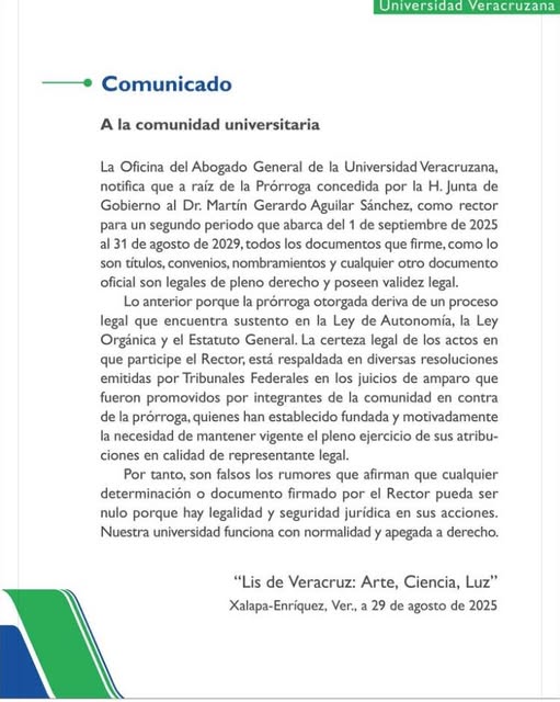 Este viernes, la Universidad Veracruzana (UV), difundió el siguiente comunicado: