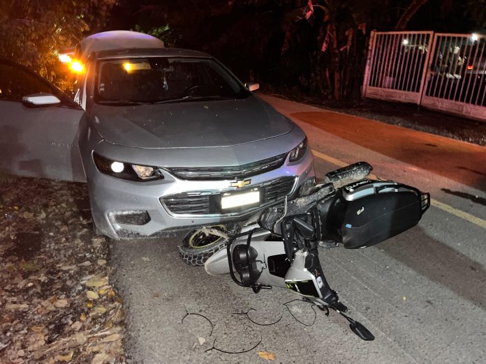 En su intento por escapar, el agresor robó la motoneta de la víctima, pero su huida fue breve: apenas metros adelante en la entrada de la comunidad Sombrerete, perdió el control y se impactó contra un vehículo gris, quedando malherido sobre el pavimento.