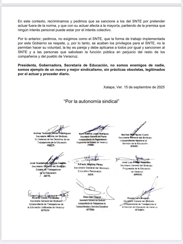 “Por lo anterior, pedimos, no exigimos como el SNTE, que la forma de trabajo implementada por este Gobierno se respete, y, por lo tanto, se acaben los privilegios para el SNTE, no le permitan hacer su voluntad, la ley es pareja y debe aplicarse a todos por igual y sancionen al SNTE y a las personas que sabotean la función pública en perjuicio del resto de los compañeros y del pueblo de Veracruz”, aseveran.