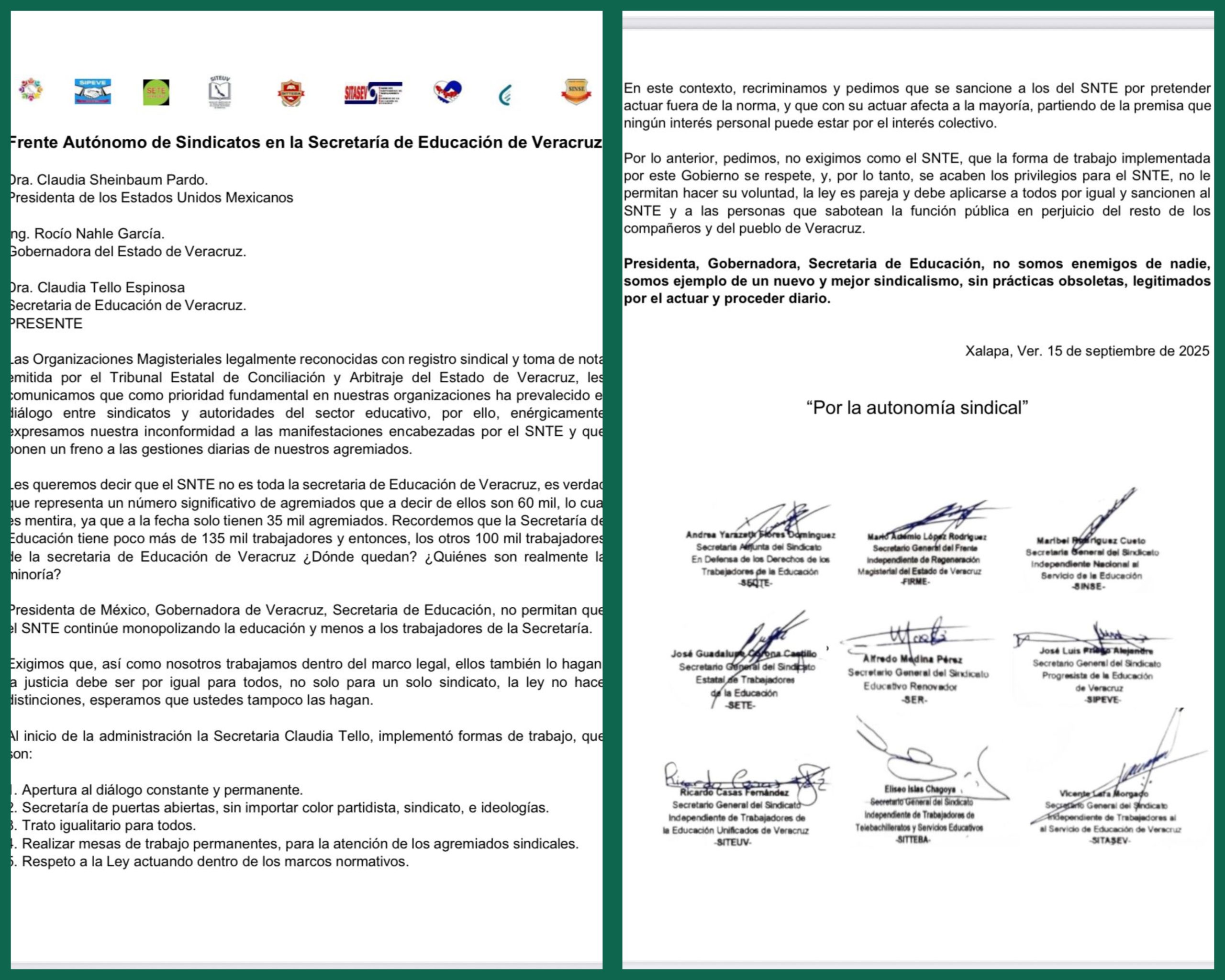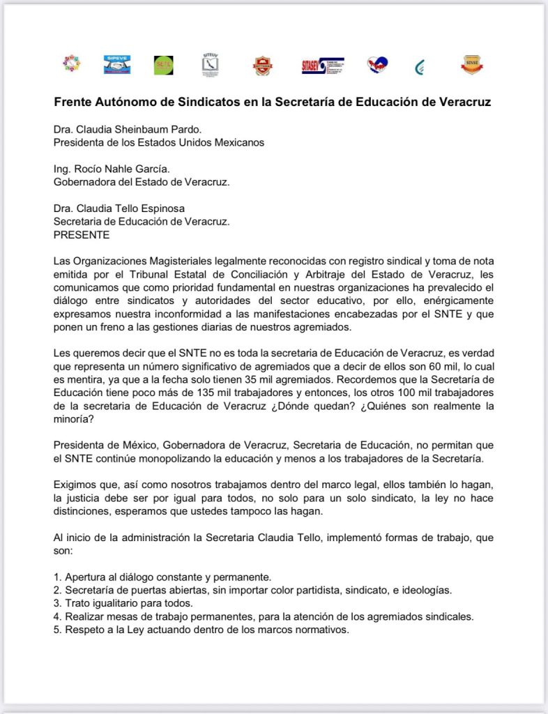 A través de un desplegado, nueve agrupaciones magisteriales de Veracruz, integradas en el llamado “Frente Autónomo de Sindicatos en la Secretaría de Educación de Veracruz” piden a la presidenta Claudia Sheinbaum Pardo, a la gobernadora Rocío Nahle García y a la secretaria de Educación Claudia Tello Espinosa que “no permitan que el SNTE continúe monopolizando la educación y menos a los trabajadores de la Secretaría”.