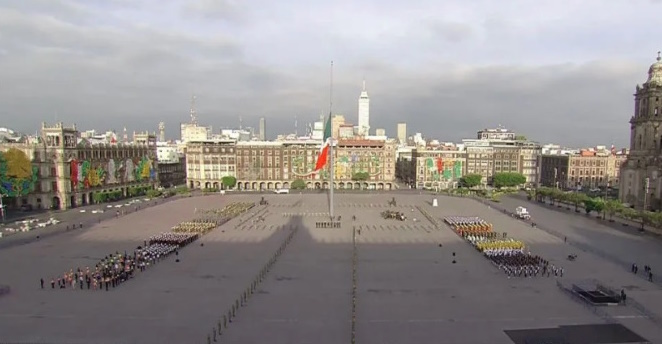 A las 7:15 de la mañana, Sheinbaum salió de Palacio Nacional en compañía de integrantes de su gabinete y a las 7:18 de la mañana dio inicio el izamiento a media hasta de la bandera.