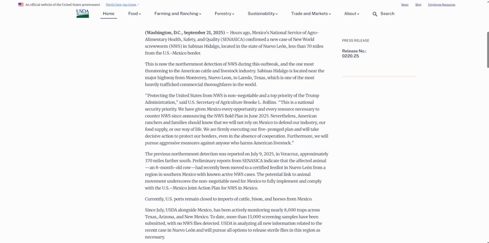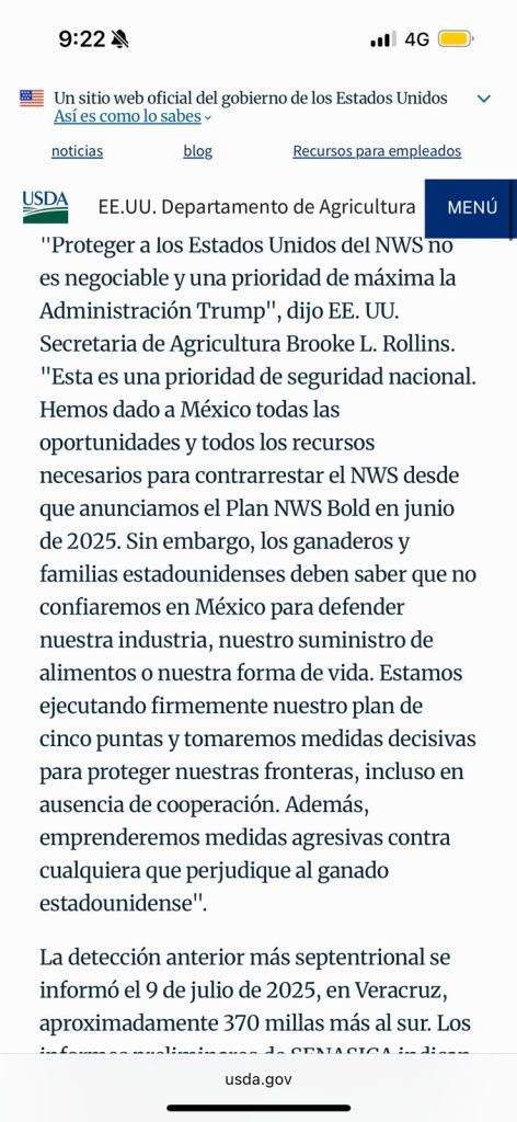 El comunicado de Estados Unidos también advirtió que “proteger a Estados Unidos del gusano barrenador es innegociable y una prioridad absoluta para la administración Trump”. En una advertencia contundente, la secretaria del USDA, Brooke L. Rollins, afirmó que el gobierno estadounidense “tomará medidas decisivas para proteger nuestras fronteras, incluso en ausencia de cooperación” y no dependerá de México para salvaguardar su industria o su suministro de alimentos.