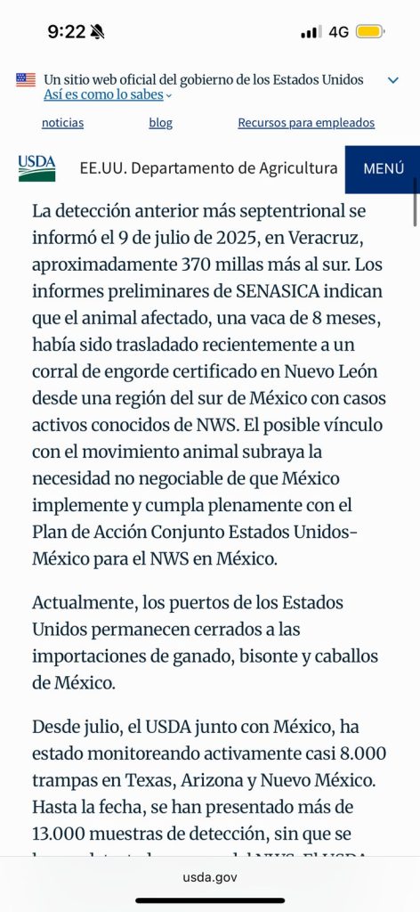 El brote en Nuevo León coloca a los productores mexicanos ante restricciones inmediatas para el movimiento de ganado y afecta el comercio agropecuario binacional. Las autoridades estadounidenses piden a los ganaderos de los estados fronterizos revisar a sus animales en busca de heridas sospechosas, secreciones o presencia de larvas, e informan que ante cualquier indicio de infección se debe contactar de inmediato al veterinario oficial o al USDA.