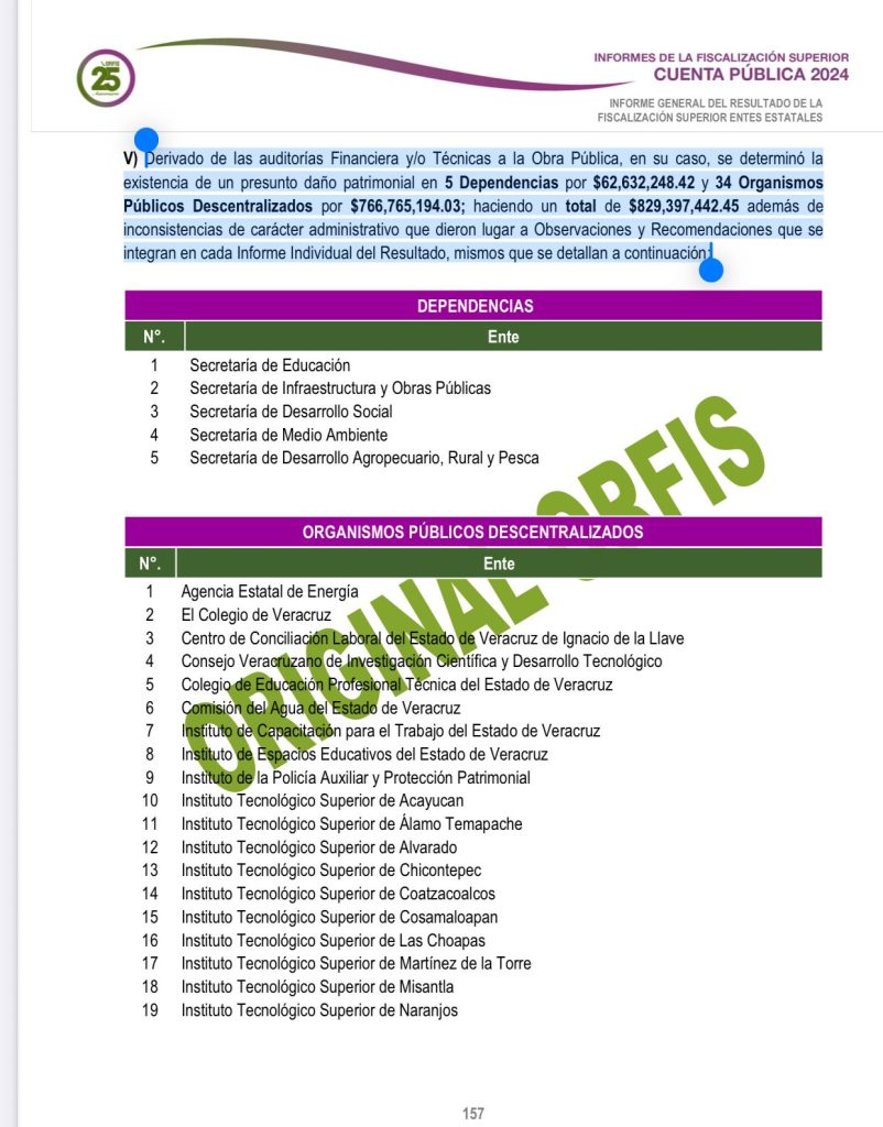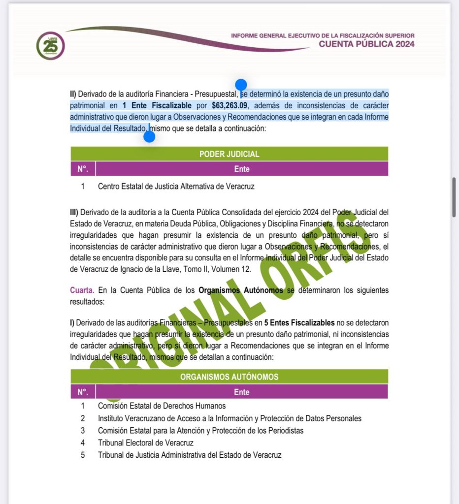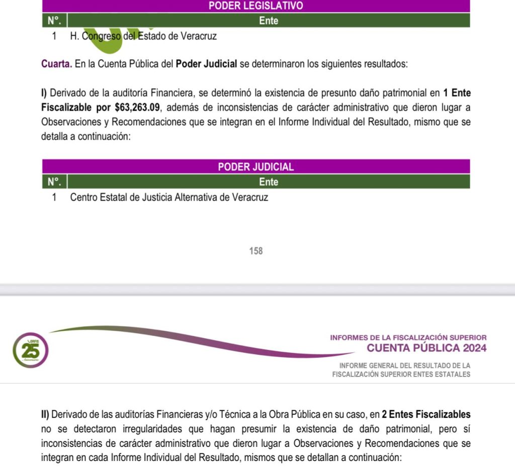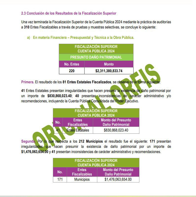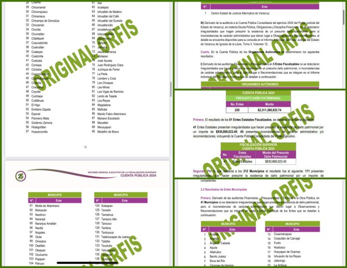 El Órgano de Fiscalización Superior entregó al Congreso Local el informe del resultado correspondiente a la cuenta pública 2024, que es el último año del Gobernador Cuitláhuac García y penúltimo de los actuales ayuntamientos y otros entes fiscalizables, la cual arroja en documentos un monto de daño patrimonial entre estado, municipios, órganos autónomos y entes paramunicipales y desconcentrados de $2 mil 311 millones 380 mil 833 pesos con 74 centavos.