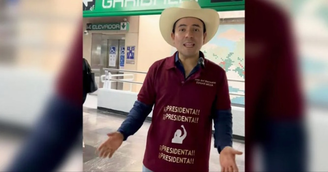 Todos, incluido él, portaban playeras blancas o guindas, con las leyendas «¡Presidenta!» y «Juez del Bienestar», con la imagen de Sheinbaum.