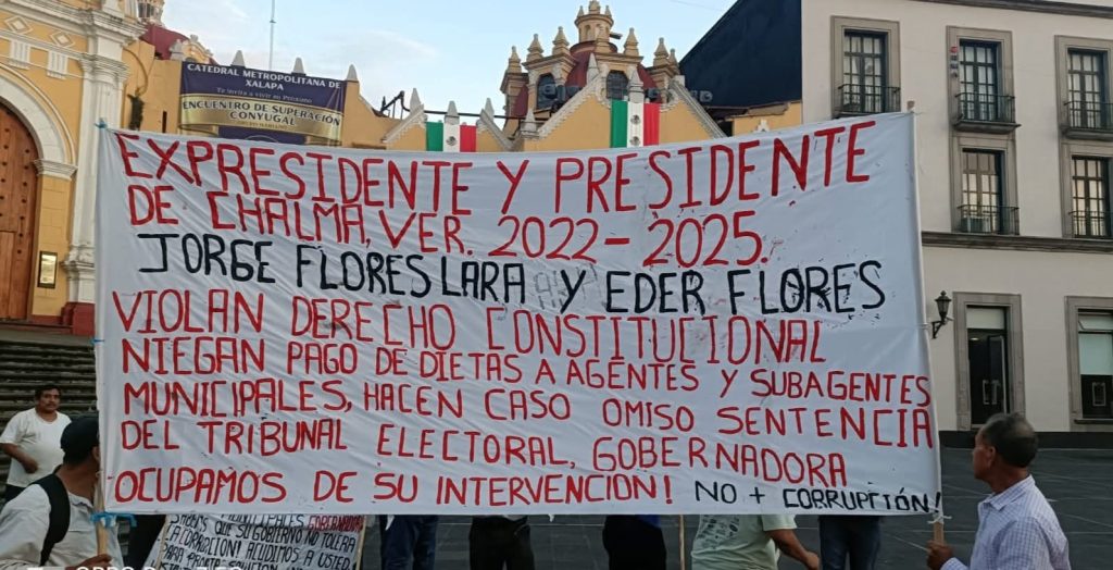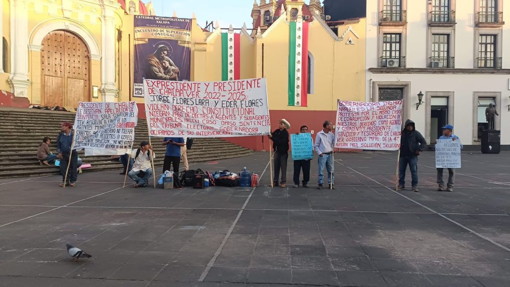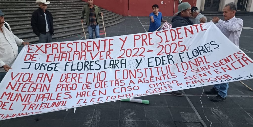 Desde las 6 de la mañana de este lunes 6 de octubre, un grupo de agentes y subagentes municipales del municipio de Chalma, ubicado al norte del estado de Veracruz, se manifestó en la Plaza Lerdo de Xalapa para exigir el cumplimiento de resoluciones legales que -aseguran- el alcalde Éder Humberto Flores Ortega ha ignorado.