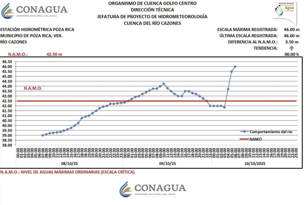 Dicho afluente se encontraba a las 7 horas de este viernes 10 de octubre 3.50 metros arriba de su NAMO (Nivel de Aguas Máximas Ordinarias).