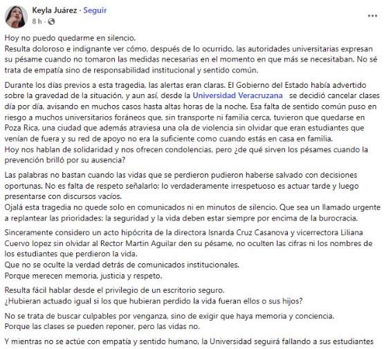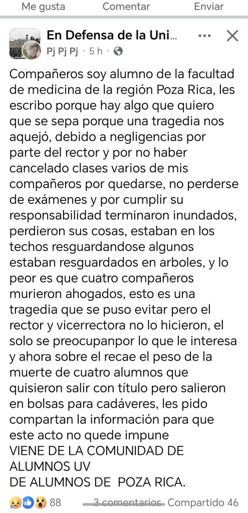 Y es que si el rector hubiese suspendido clases con anticipación y no de último momento, Diana Jael Cuervo Santos, como estudiante foránea (era originaria de Tamiahua), al igual que otros de sus compañeros, les habría dado tiempo de irse a sus lugares de origen.