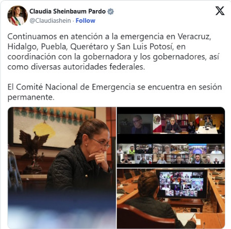 “Continuamos en atención a la emergencia en Veracruz, Hidalgo, Puebla, Querétaro y San Luis Potosí, en coordinación con la gobernadora y los gobernadores, así como diversas autoridades federales. El Comité Nacional de Emergencia se encuentra en sesión permanente”, menciona el mensaje.