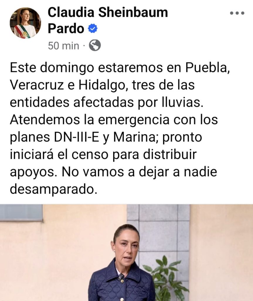 En sus redes sociales, la mandataria confirmó que visitaría Veracruz, Puebla e Hidalgo como parte del plan de emergencia federal para atender a las personas damnificadas.