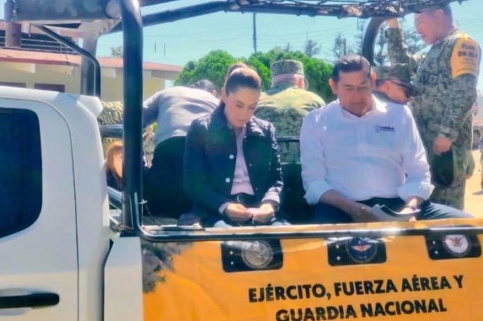 Ante los reclamos, Sheinbaum se subió a una camioneta del Ejército, y en medio de la gritería pidió que le permitieran hablar mientras un joven exigía información sobre tres de sus compañeros de la Universidad Veracruzana.