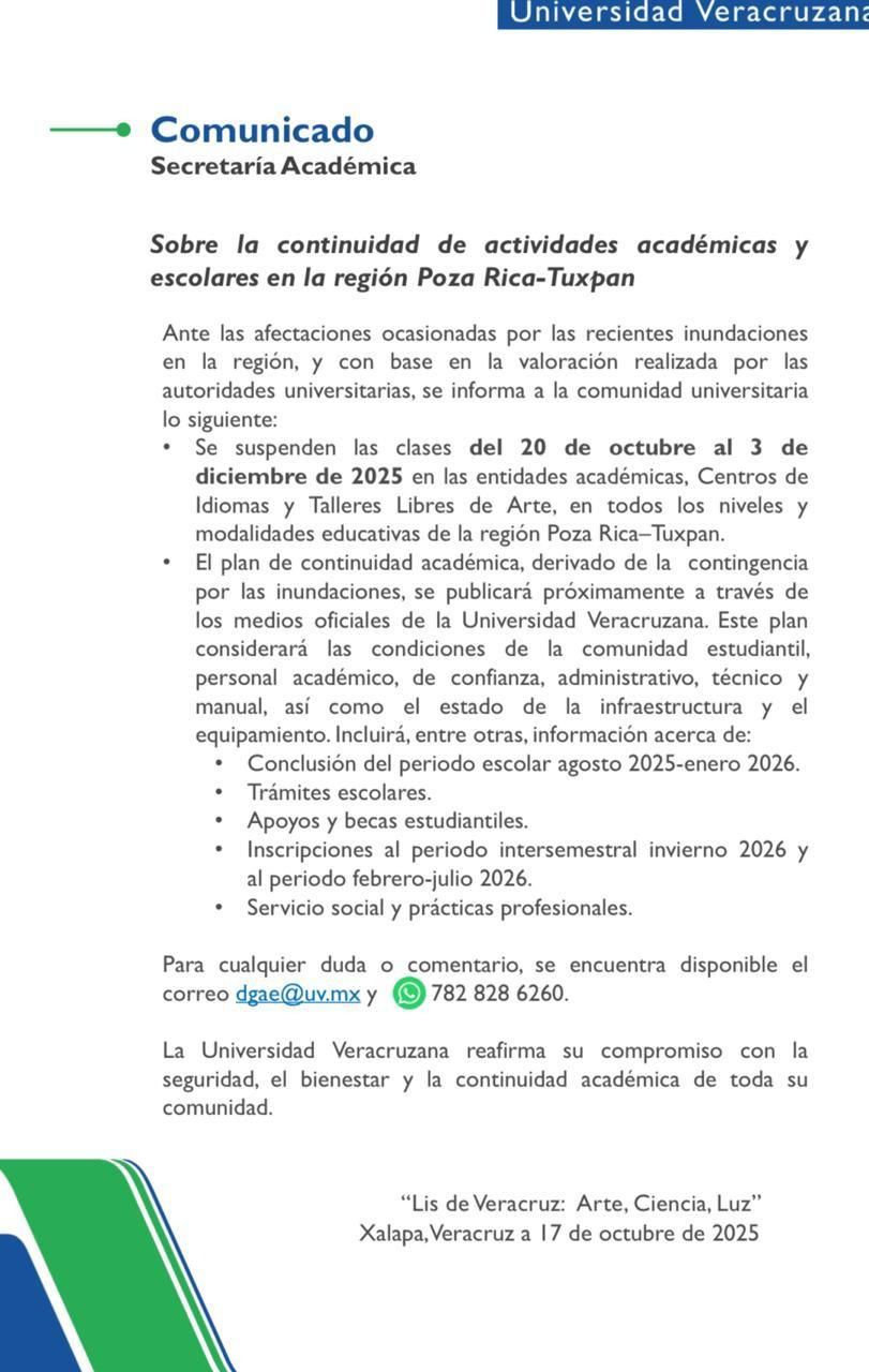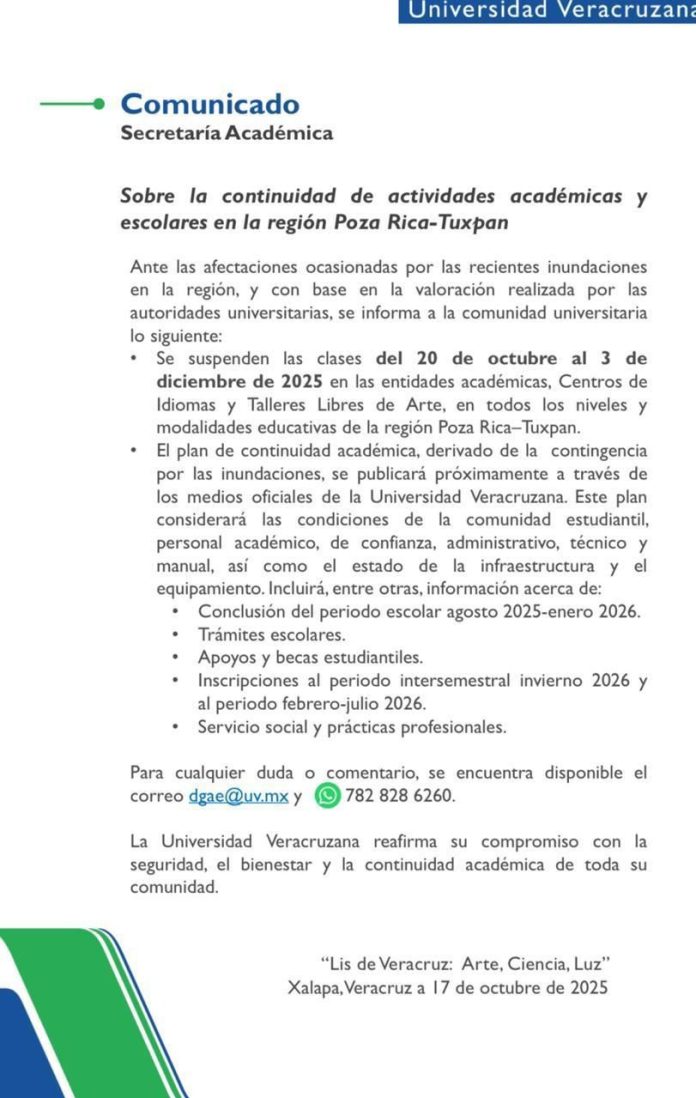 Activa la UV el Plan académico emergente. En los próximos días informarán cómo se dará continuidad a las clases de este semestre agosto 2025-enero 2026.