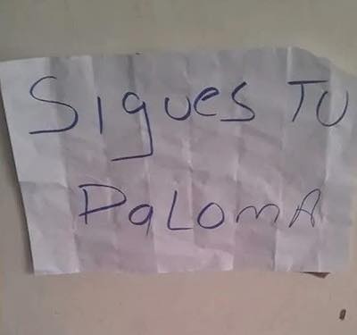 «Sigues tú Paloma», fueron los mensajes plasmados en cartulinas y hallados por el turno de la vigilancia de esta madrugada, uno en la puerta de su oficina y el otro en una pared adjunta.