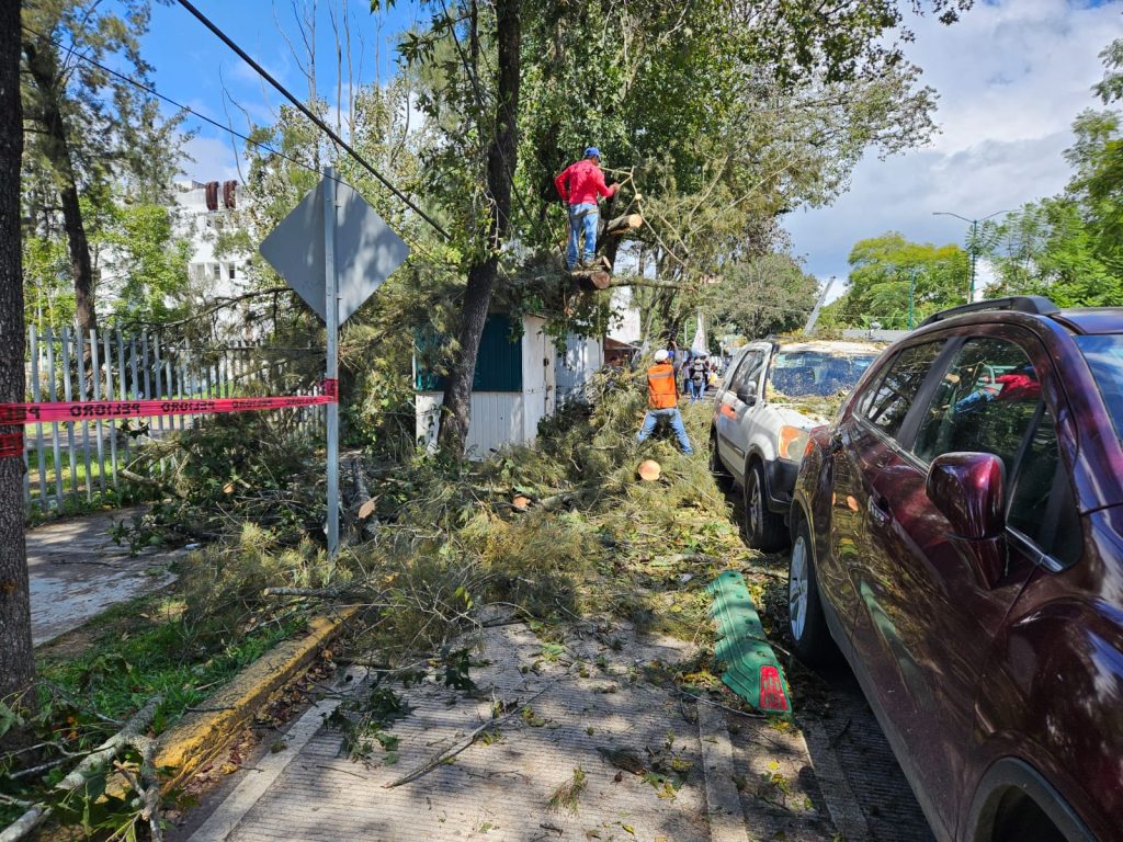 El árbol causó daños a tres camionetas, una estacionada dentro del plantel educativo y dos sobre la vía pública, así como a un local de comida ubicado en la banqueta.
