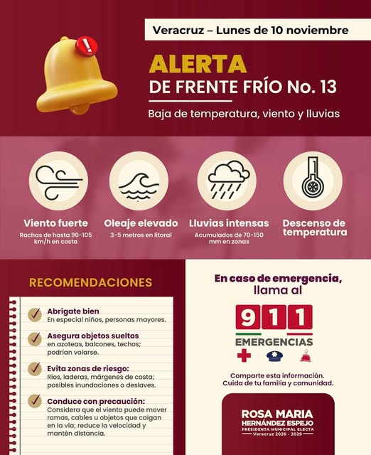 «Amigas y amigos: sigamos las recomendaciones para salvaguardar nuestra integridad y la de nuestras familias, ante la alerta por el frente frío No. 13 que ya se siente en nuestra ciudad de Veracruz».