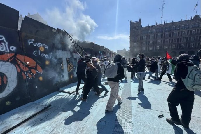 Durante la marcha de la llamada Generación Z, un grupo de jóvenes encapuchados se enfrentó a la policía y derribó algunas vallas de seguridad que rodeaban al Palacio Nacional en el Zócalo.