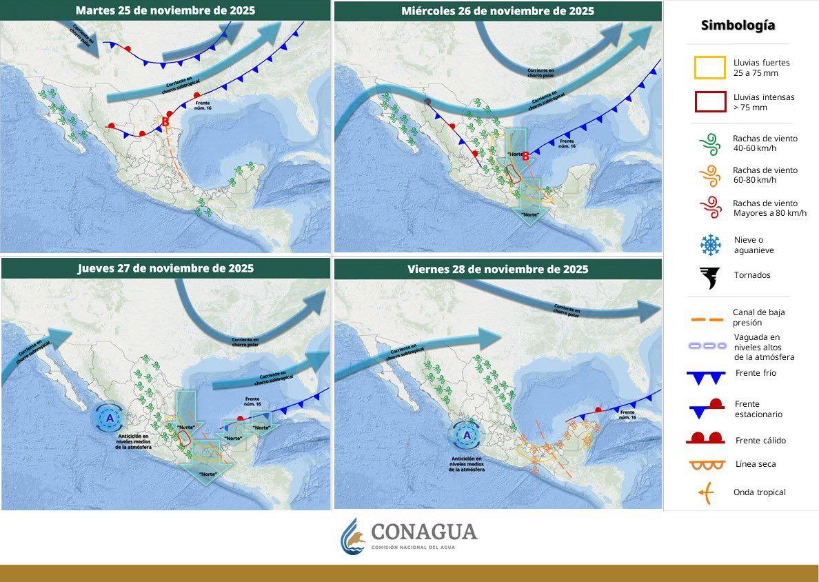 De acuerdo con la Comisión Nacional del Agua (Conagua), se prevé que el frente frío número 16 afecte la entidad veracruzana a partir del mediodía del miércoles 26 y hasta el viernes 28, generando condiciones de tiempo inestable durante este periodo.