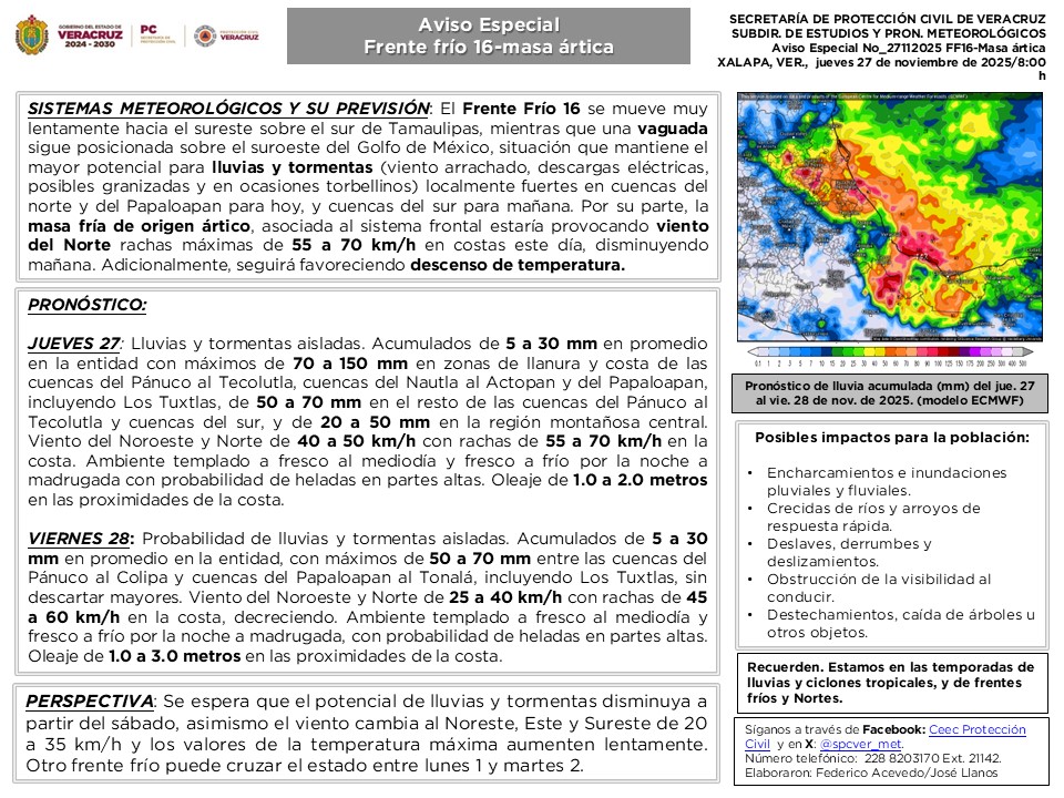 Frente frío 16 disminuirá el sábado pero entre lunes y martes podría ingresar otra masa de aire ártico al estado de Veracruz noviembre 27, 2025 FacebookTwitterWhatsAppTelegram